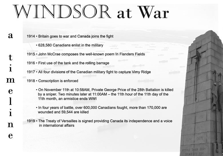 Canada saw conflict like never previously imagined. And Canadian soldiers paid for it in tragic numbers. Some particularly devastating battles were the poison gas attacks of Ypres in 1915, and the Somme and Vimy Ridge fights in 1916. Vimy was a bloody and tragic event, and the city of Windsor was profoundly affected as the list of casualties from the area was particularly high.